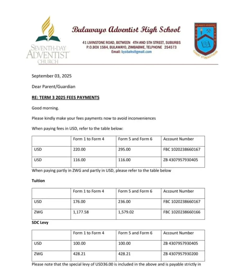Bulawayo Adventist High School offers affordable and well-structured school fees to support quality education for all learners. As of Term 3, 2025, the fees are structured as follows: