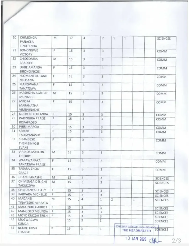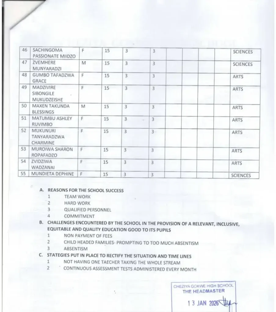 Cheziya Gokwe High School has consistently demonstrated commendable academic performance in both Ordinary Level (O-Level) and Advanced Level (A-Level) examinations. In 2025, the school produced remarkable results. Below is a detailed breakdown of the A-level results: