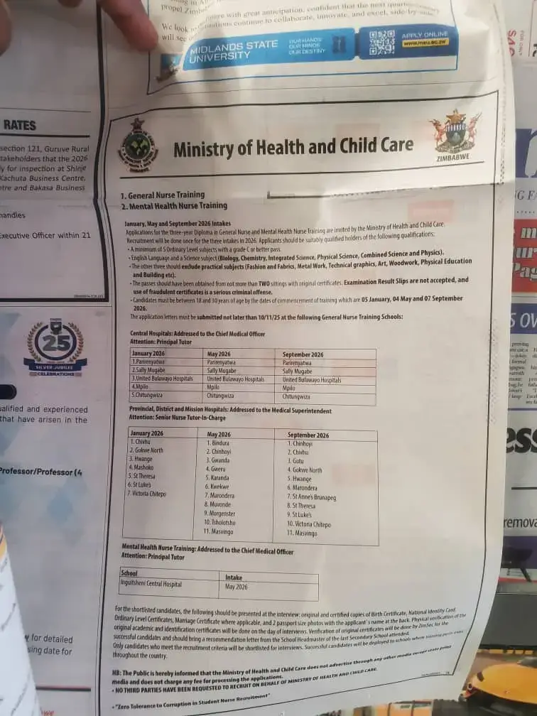 The Ministry of Health and Child Care (MoHCC) invites suitably qualified applicants for the 2026 intakes into the Three-Year Diploma in General Nursing and Mental Health Nursing programmes.