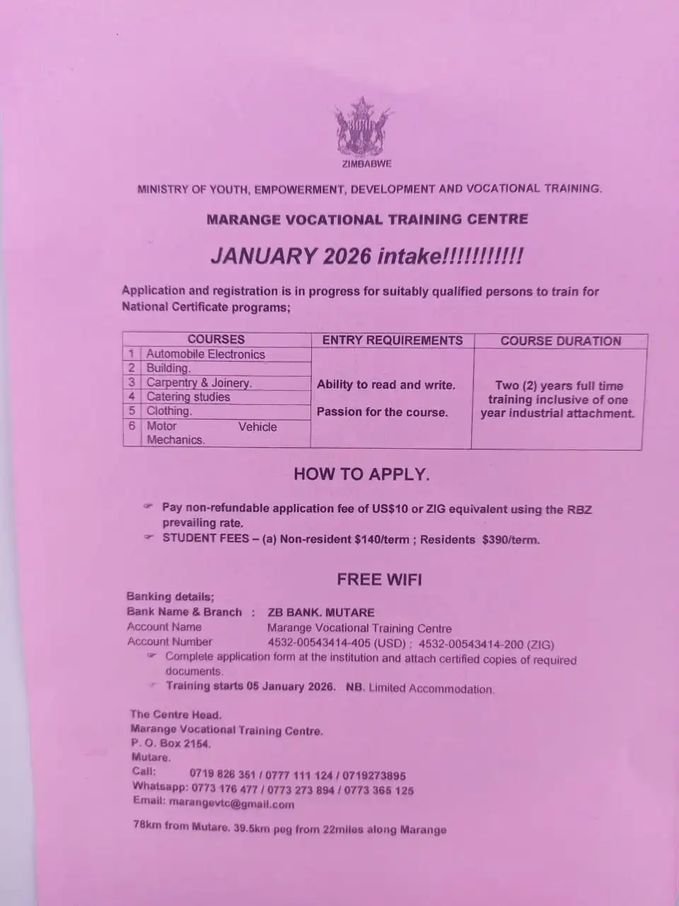 Marange Vocational Training Centre is now accepting applications for the January 2026 intake. If you're passionate about hands-on skills and looking to earn a National Certificate, this is your opportunity to train under the Ministry of Youth, Empowerment, Development, and Vocational Training.