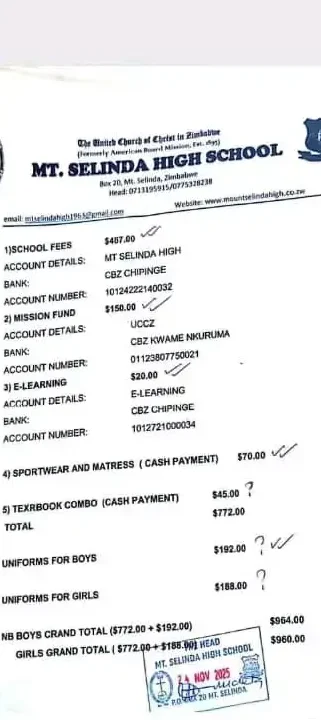 Mt Selinda High School fees are $485 per term for boarders and $150 for day scholars.