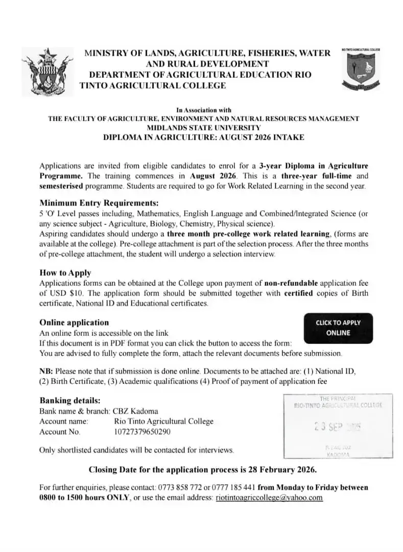 With a strong focus on hands-on training, including industrial attachment on approved farms, this program ensures that graduates are well-prepared to contribute to Zimbabwe’s agricultural growth. Applications for the August 2026 intake are now open.