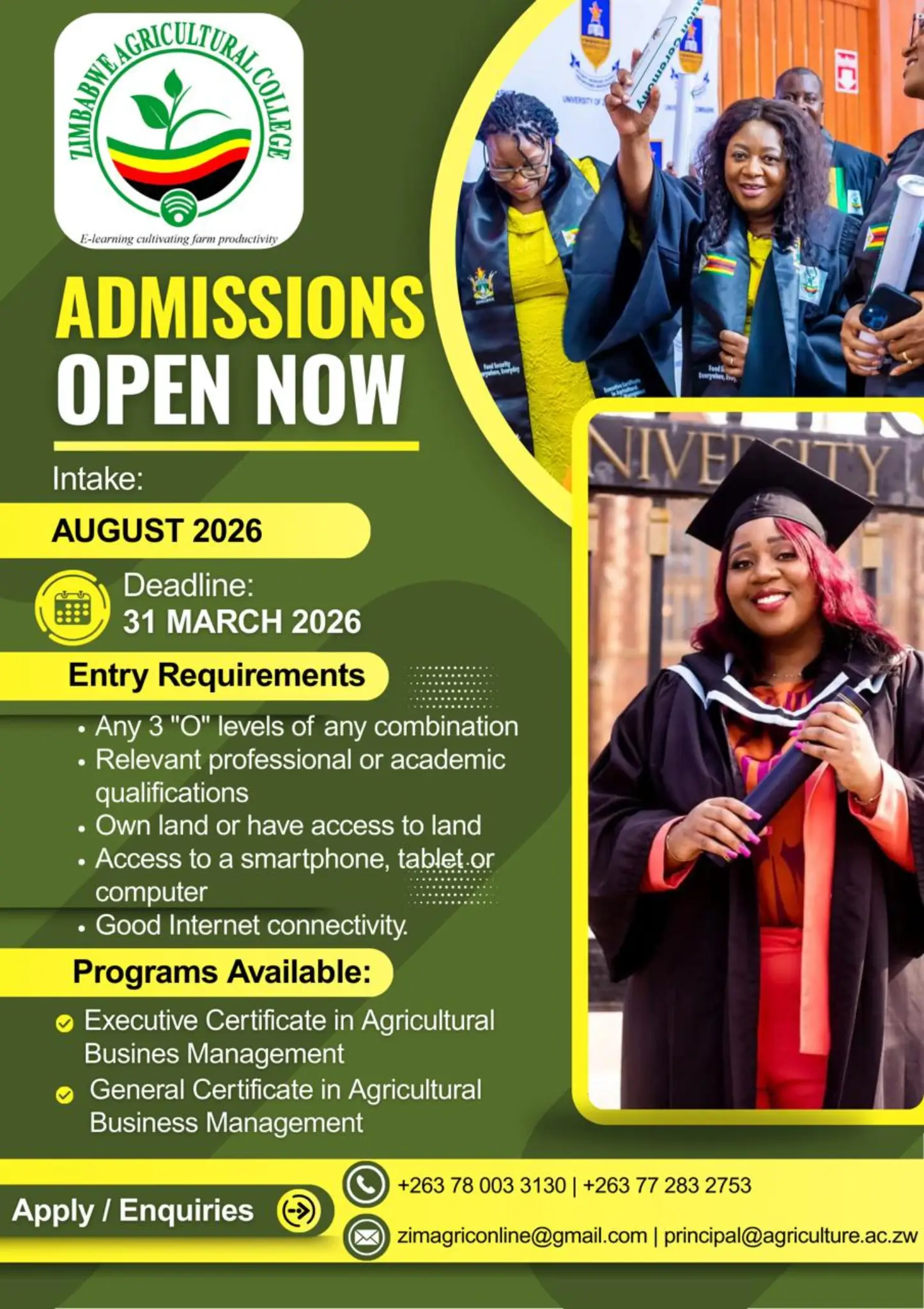 The Zimbabwe Agricultural College (ZIACO) is now enrolling students for its 9th virtual intake starting August 2026. Formed in April 2023 under the Ministry of Lands, Agriculture, Fisheries, Water, and Rural Development, ZIACO aims to empower individuals across the agricultural value chain, from land reform beneficiaries to smallholder farmers, farm personnel, and agri-entrepreneurs.